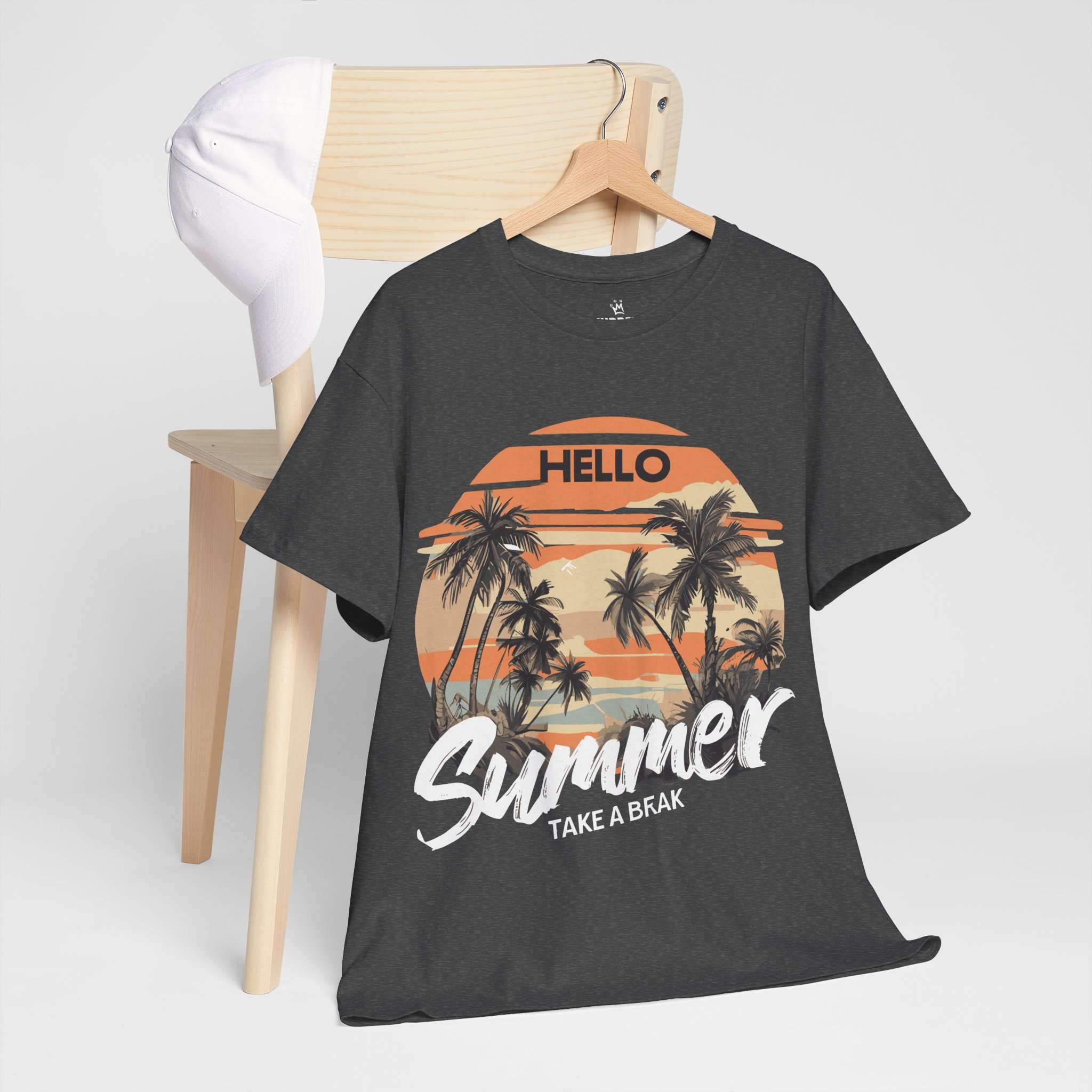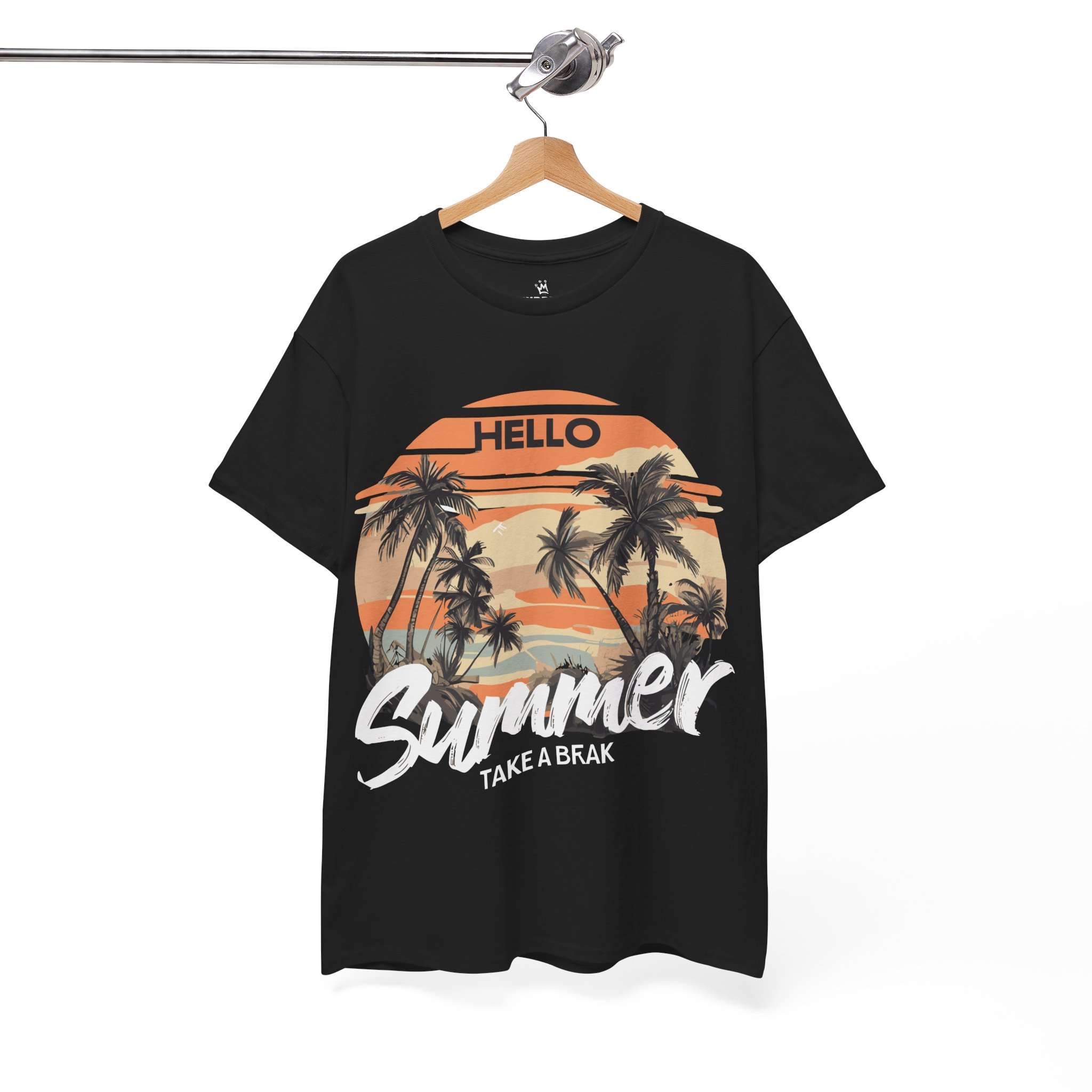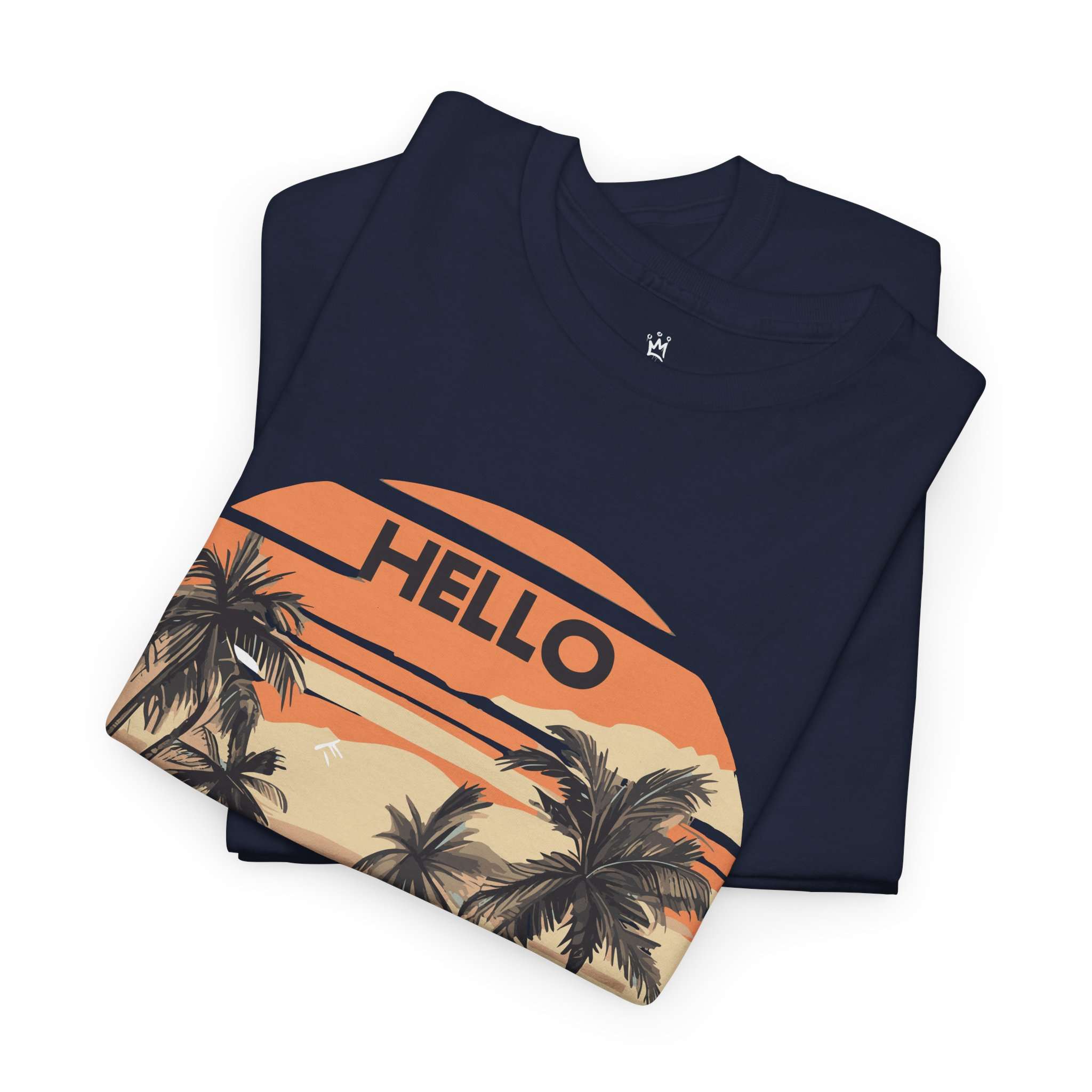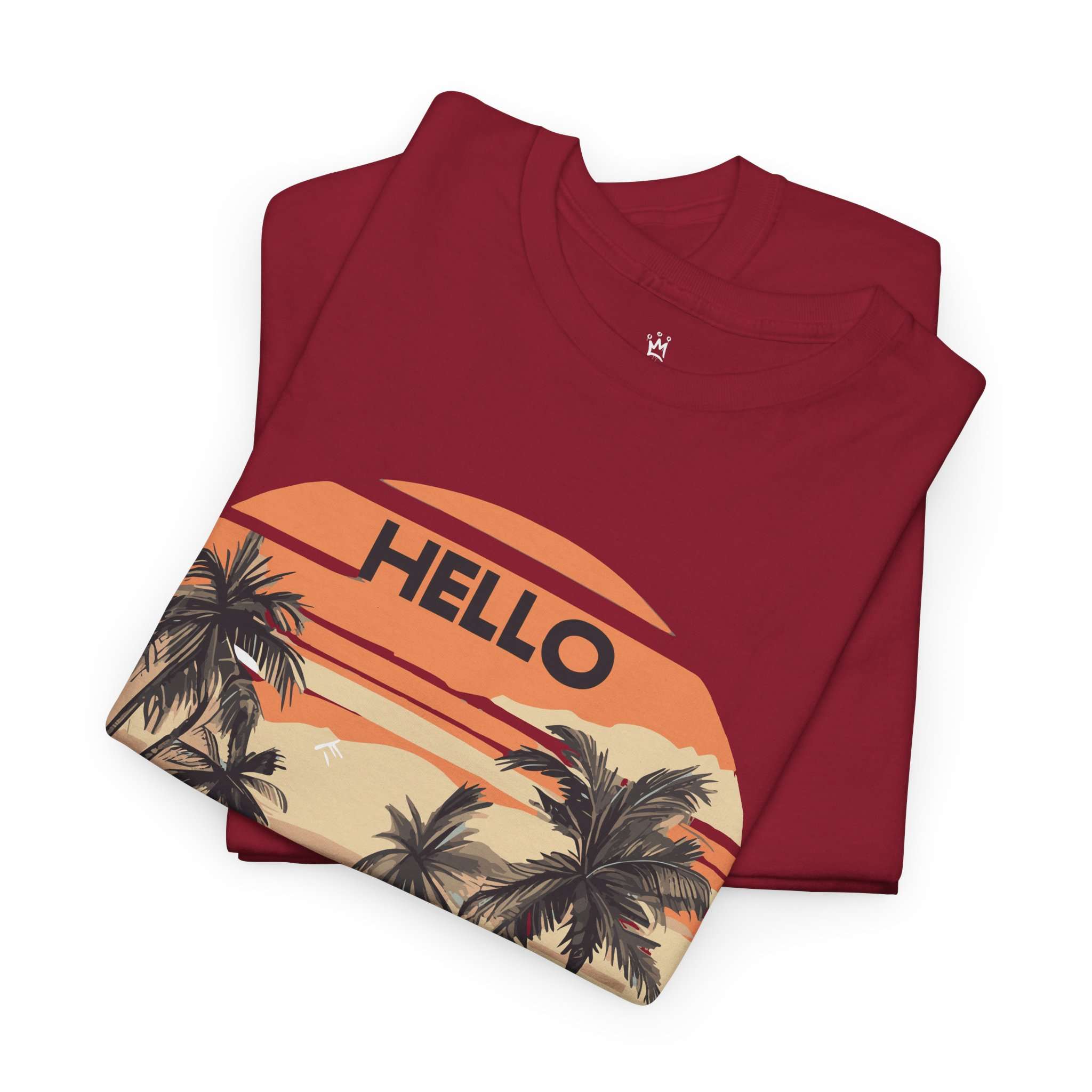 Bring the tropical sunset vibes to your wardrobe with this Hello Summer graphic t-shirt. Featuring retro palm trees and a warm orange sunset, this shirt is perfect for vacations, beach trips, and casual summer outfits.