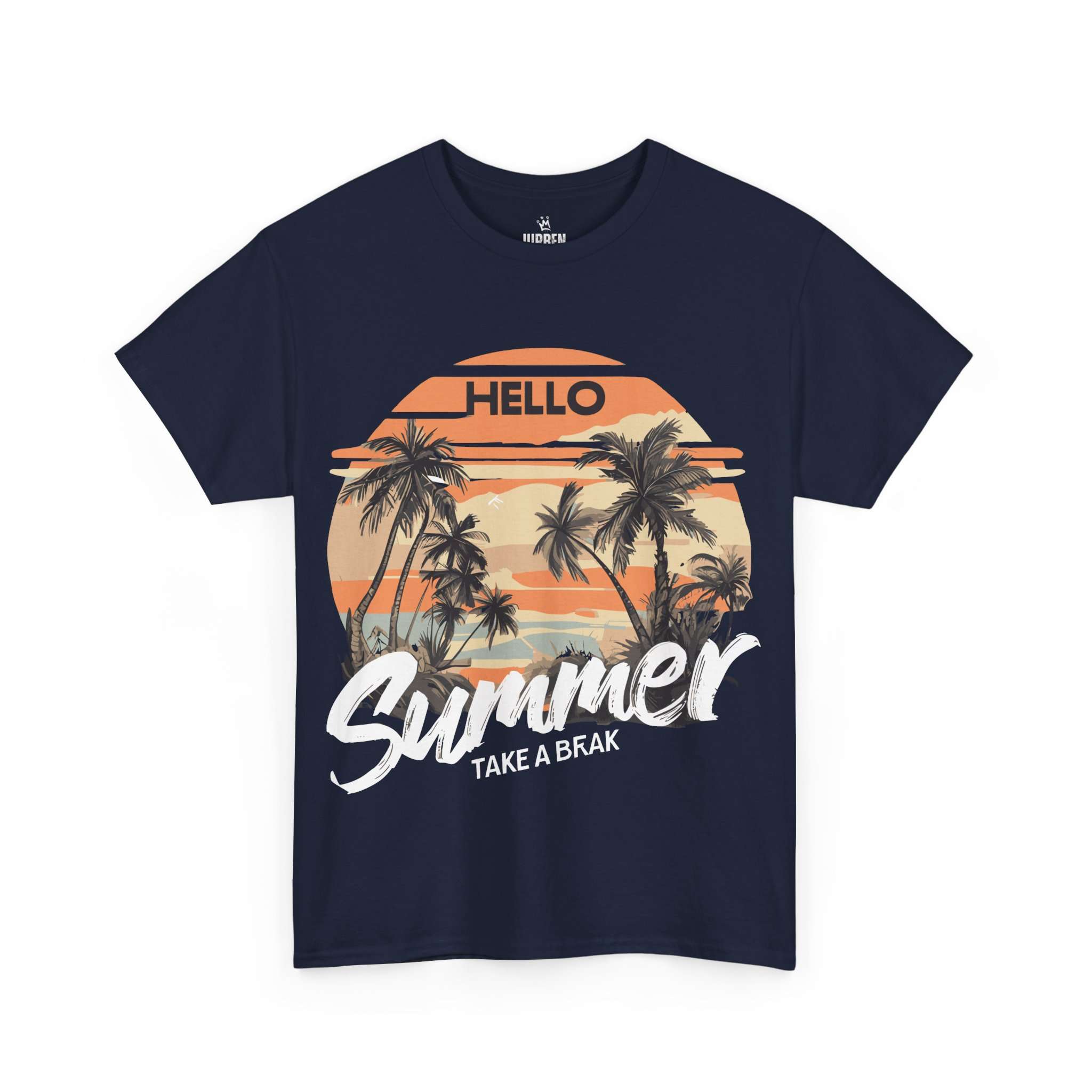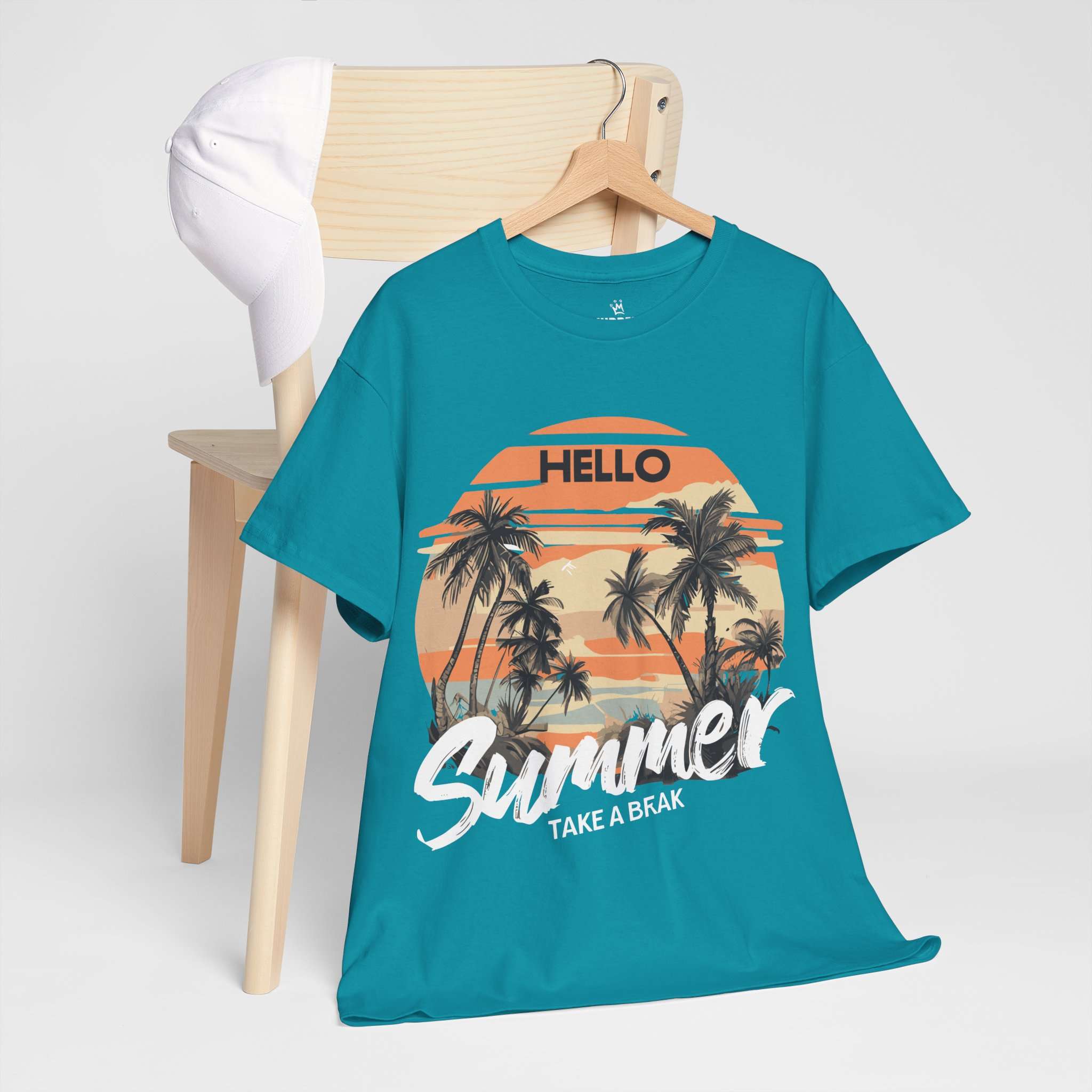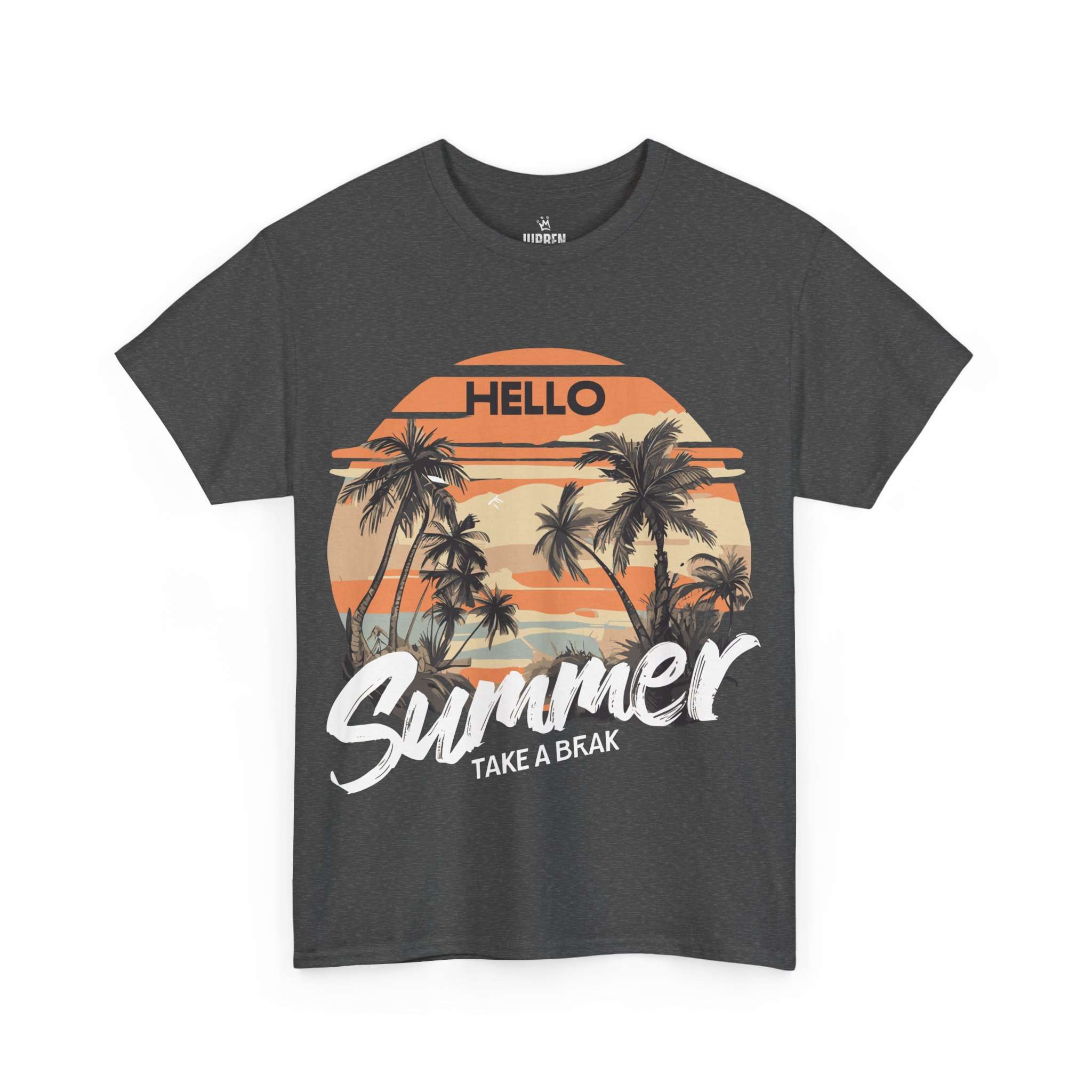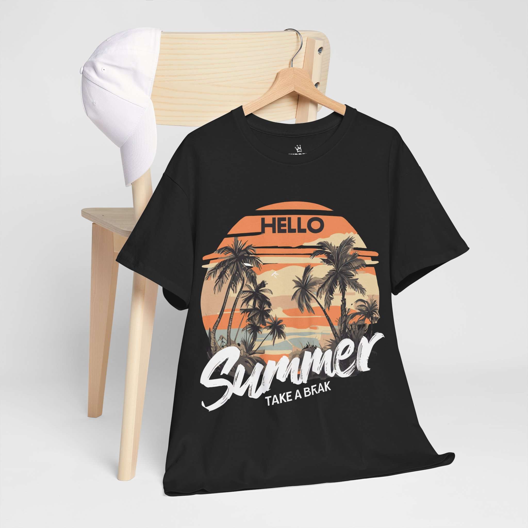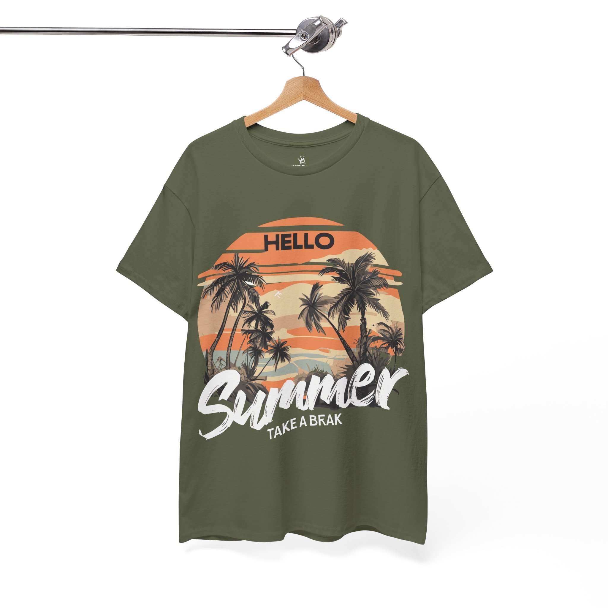 Bring the tropical sunset vibes to your wardrobe with this Hello Summer graphic t-shirt. Featuring retro palm trees and a warm orange sunset, this shirt is perfect for vacations, beach trips, and casual summer outfits.