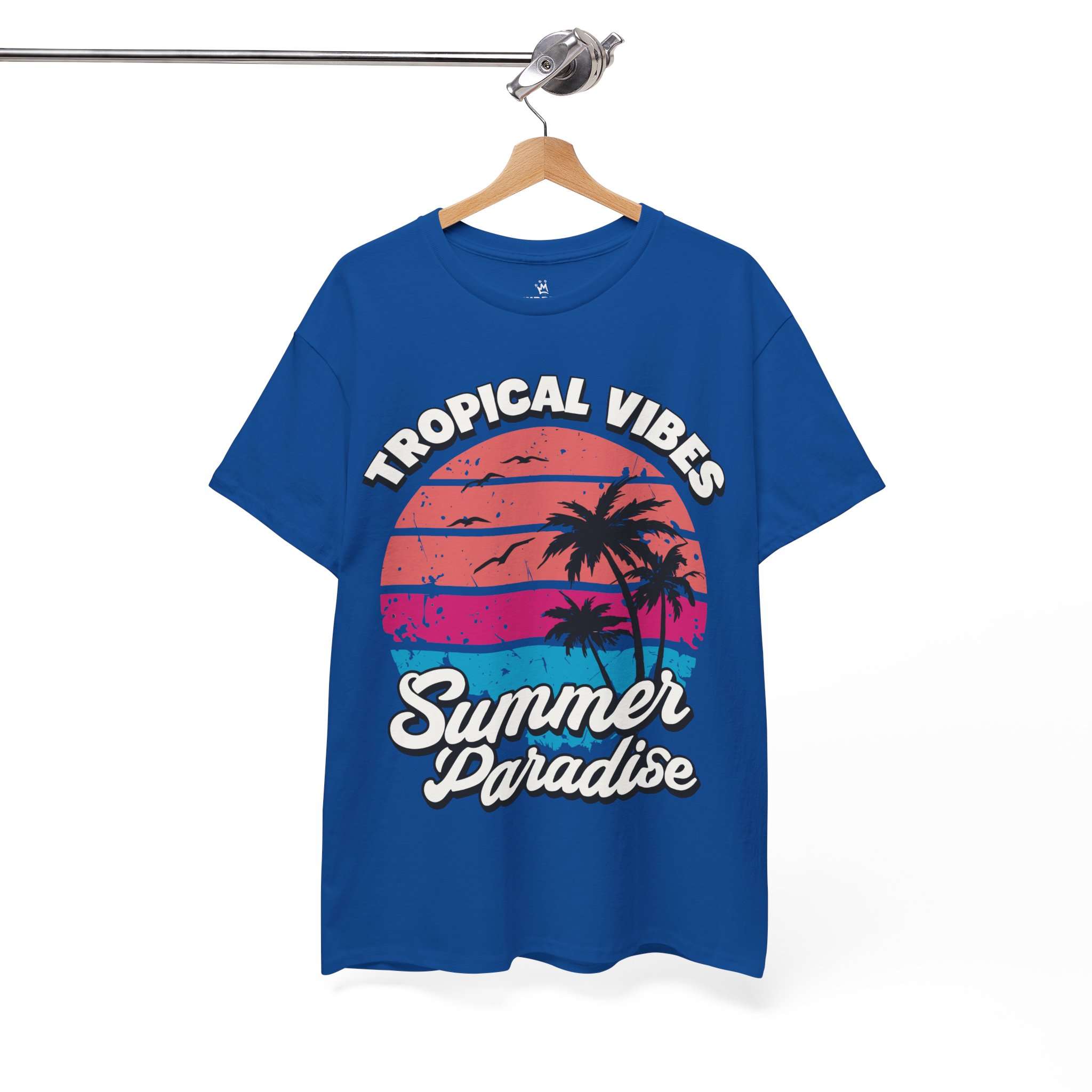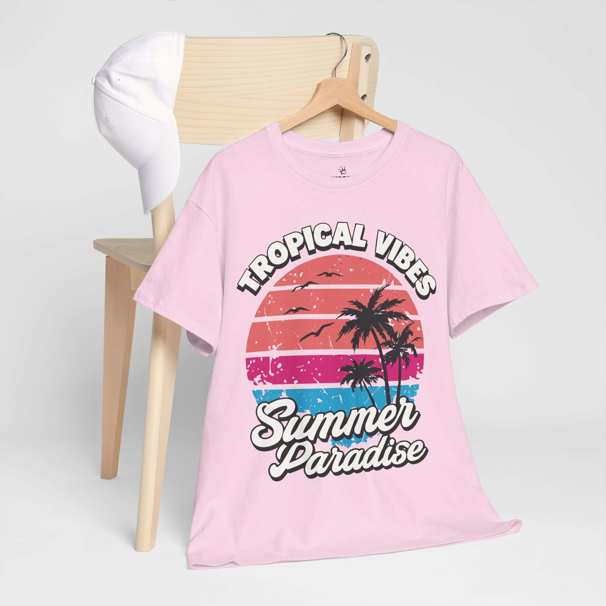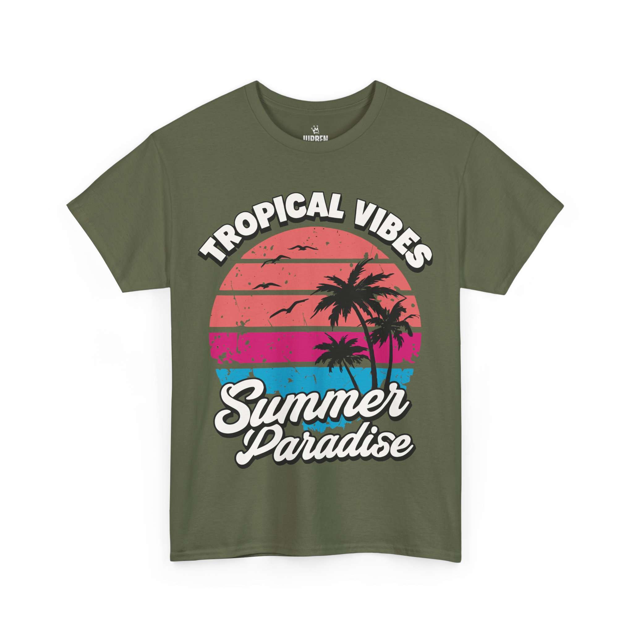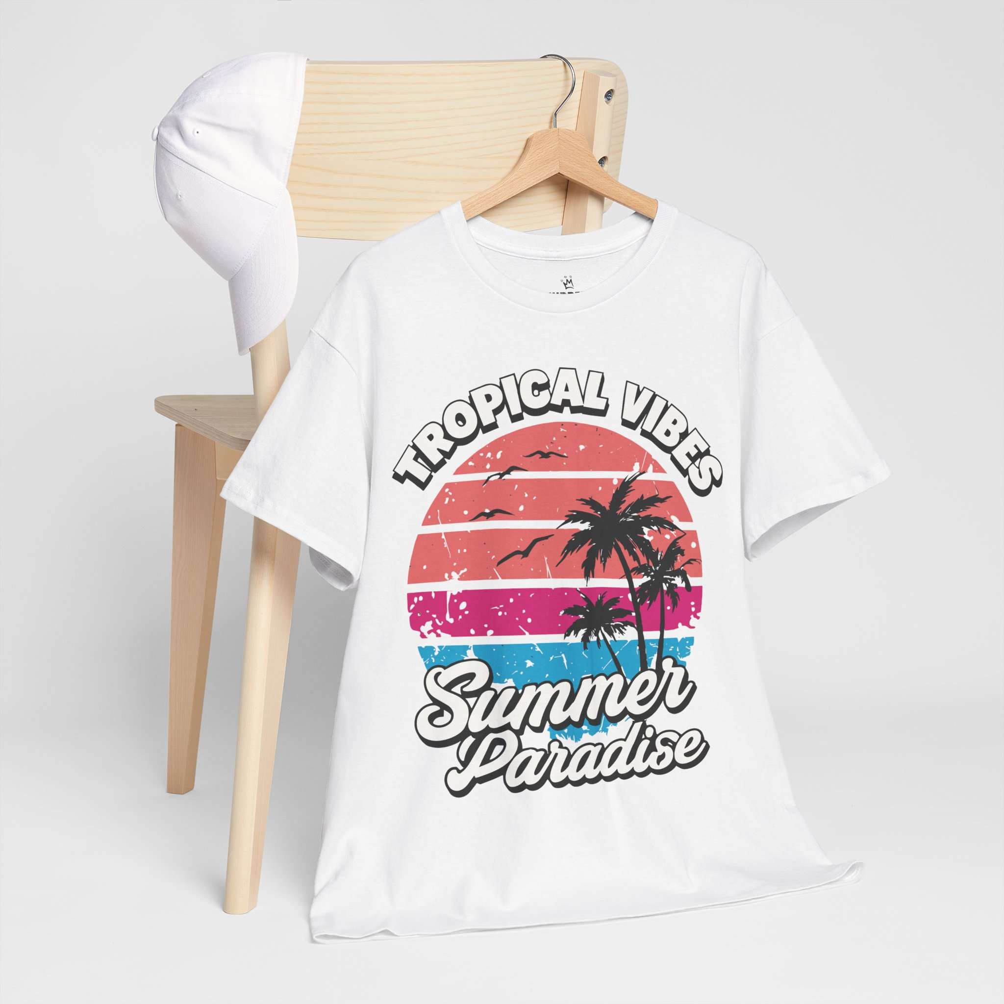 Bring the tropical vibes wherever you go with this Tropical Vibes Summer Paradise t-shirt! Featuring a retro sunset with palm trees and ocean colors, this tee is perfect for summer lovers, beach vacations, and those who enjoy a relaxed island lifestyle.